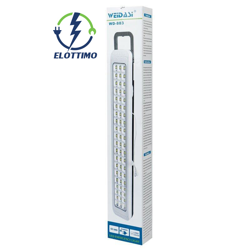 چراغ اضطراری ویداسی 883 یک وسیله کاربردی و ضروری است که مجهز به 60 لامپ LED از نوع SMD با شارژدهی بالااست که قابلیت نور دهی به دو صورت نور کم و زیاد است. منبع تغذیه چراغ ویداسی برق شهری(AC) است. شما میتوانید برای حمل اسان این چراغ از دسته آن استفاده کنید و همچنین از آویز پشت بدنه چراغ برای نصب روی دیوار و سطوح دیگر استفاده کنید. رنگ نور این لامپ ها از نوع مهتابی است.
